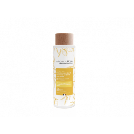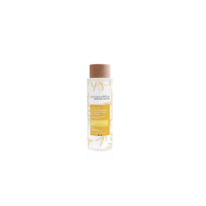 Le Shampooing Sans Sulfates et Sans Silicones Nutrition 250ml AromaKer aux huiles essentielles de Bergamote et d’Amande Amère régule l’équilibre du cuir chevelu, aide à avoir une production de sébum optimale pour nourrir les cheveux secs, tonifie et apporte à la chevelure énergie et souplesse. Les cheveux retrouvent douceur et brillance. Une vraie action en profondeur : Lisse la fibre capillaire, Facilite le démêlage, Gaine et répare les cheveux abimés tout en les nourrissant en profondeur.