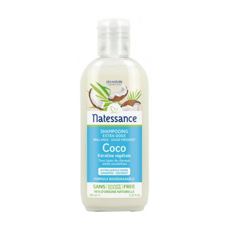 Natessance Shampoing Coco et Kératine Végétale est un shampoing extra-doux adapté à tous les types de cheveux. Ce shampoing associe 2 actifs phares : l'huile de coco bio et la kératine végétale. L'huile de coco bio est riche en acide laurique, ce qui lui confère une forte affinité pour la fibre capillaire qu'elle restructure, nourrit et lisse. La kératine végétale fortifie et régénère.