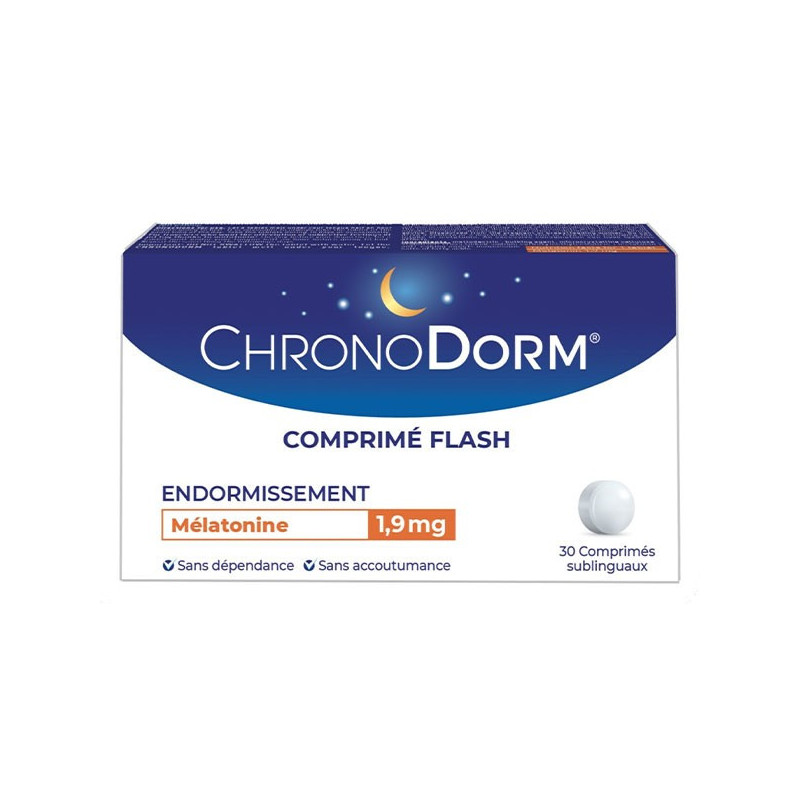 Complément alimentaire ChronoDorm Mélatonine 1.9 mg des Laboratoires Iprad, à base de Mélatonine, qui contribue à réduire le temps d'endormissement chez les personnes ayant des troubles du sommeil