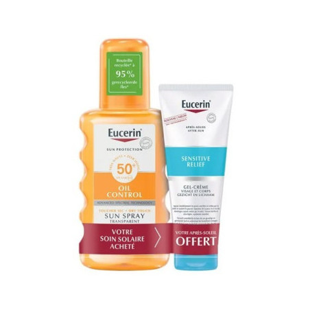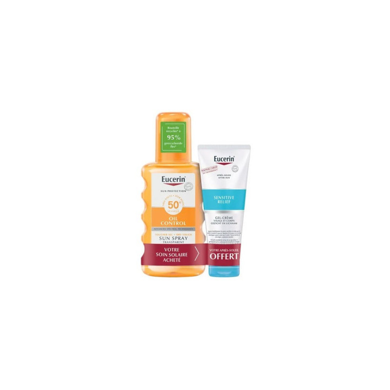 Eucerin Sun Oil Control Spray transparent toucher sec SPF50+ 200 ml + Mini After Sun Sensitive Relief visage et corps 50 ml offert, vendu sur notre site de parapharmacie discount. Un duo parfait pour une peau protégée et préservée tout l'été.