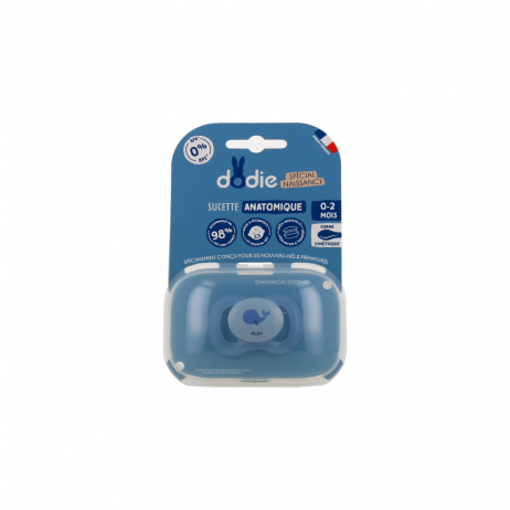 Sans BPA ni BPS, la sucette anatomique Dodie spécial naissance est déclinée en divers motifs autour du thème de la mer : baleine, crabe, tortue, pieuvre ou encore étoile de mer. Elle est fournie avec une petite boîte transparente pour le transport et la stérilisation.