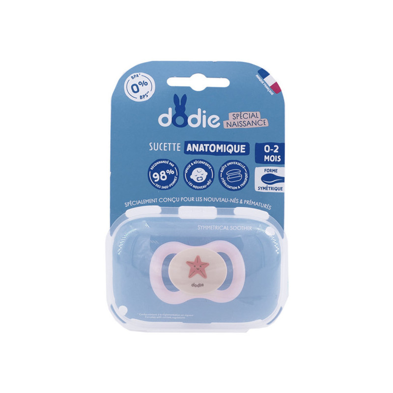Conçue avec des experts et recommandée par 98 % des sages-femmes, la sucette anatomique naissance Dodie répond au fort besoin de succion des nourrissons, apaise et réconforte. Il s'agit d'une sucette pour bébé à la forme symétrique et réversible afin d'offrir un bon positionnement dans la bouche.