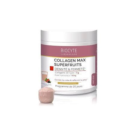 Afin d'agir sur les signes de l'âge, Biocyte a développé Collagen Max Superfruits, et Cacao une formule ultra-concentrée en collagène.